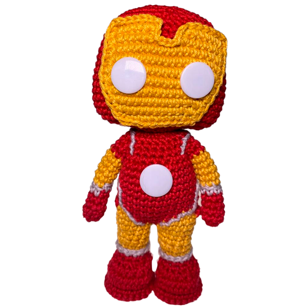 Boneco Homem De Ferro feito em crochê com braços e pernas articulaveis.