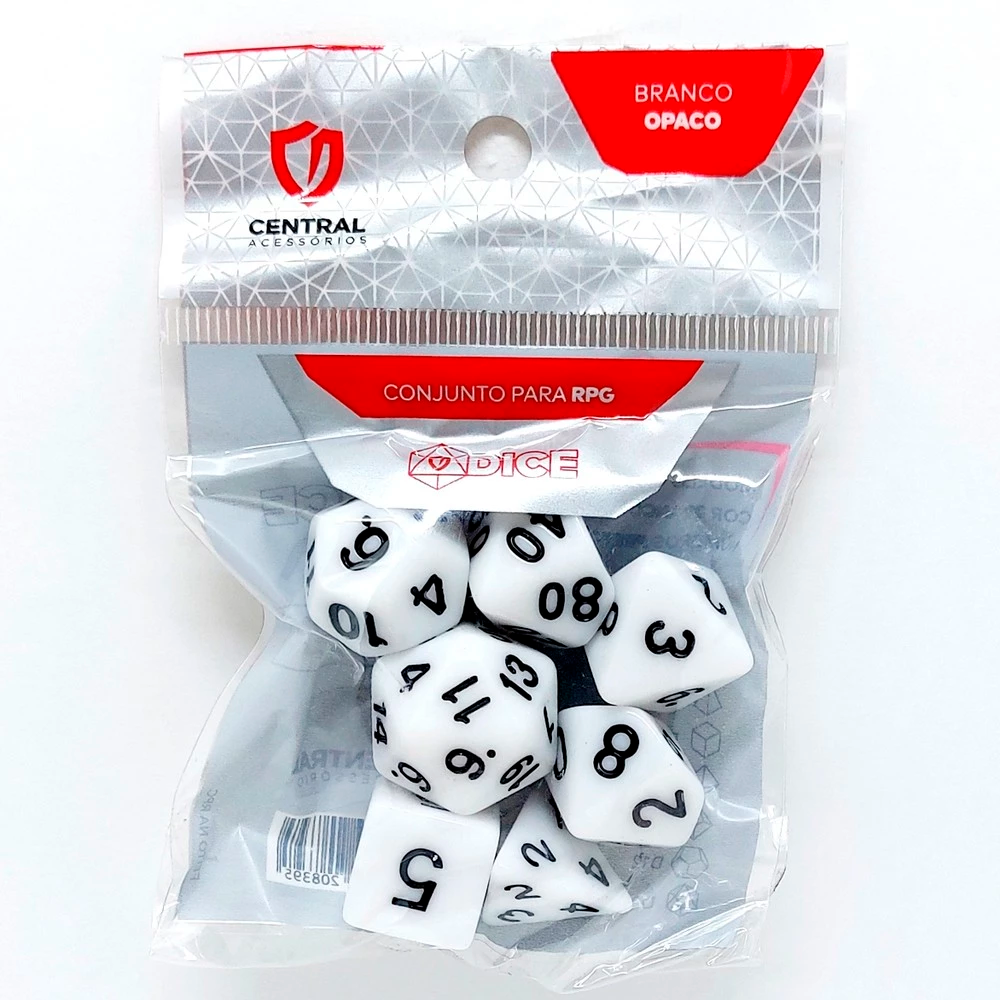 Contém 7 dados de diversos lados de 20 mm: 1 D4 1 D6 1 D8 1 D10 1 D10 (DEZENAS) 1 D12 1 D20